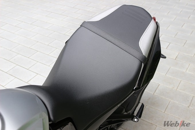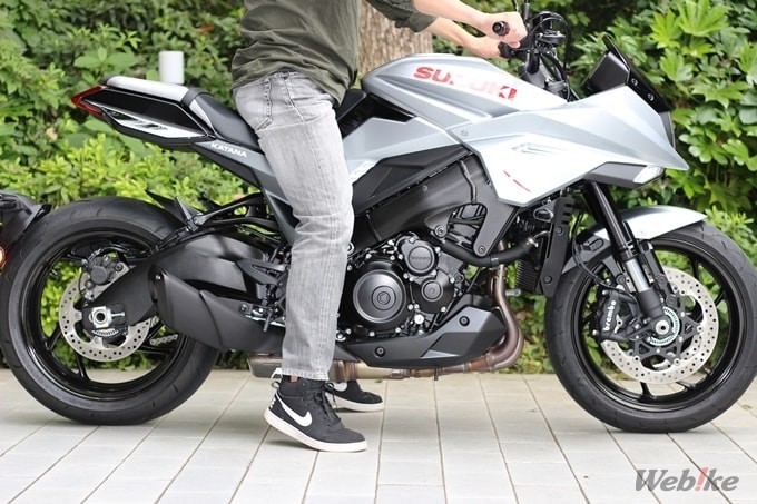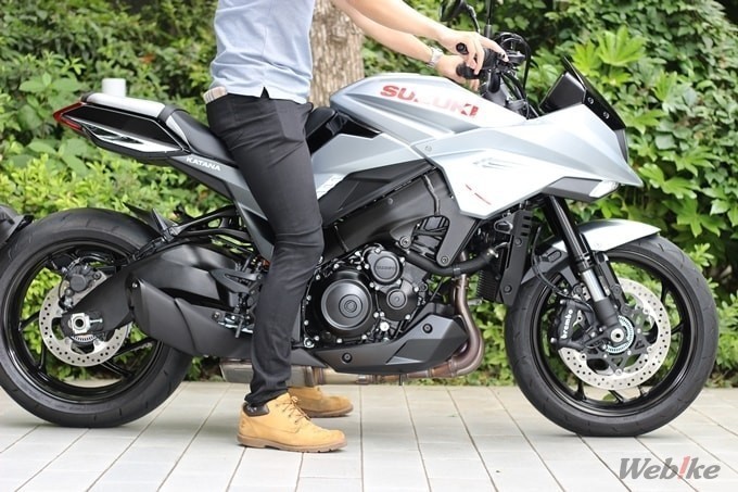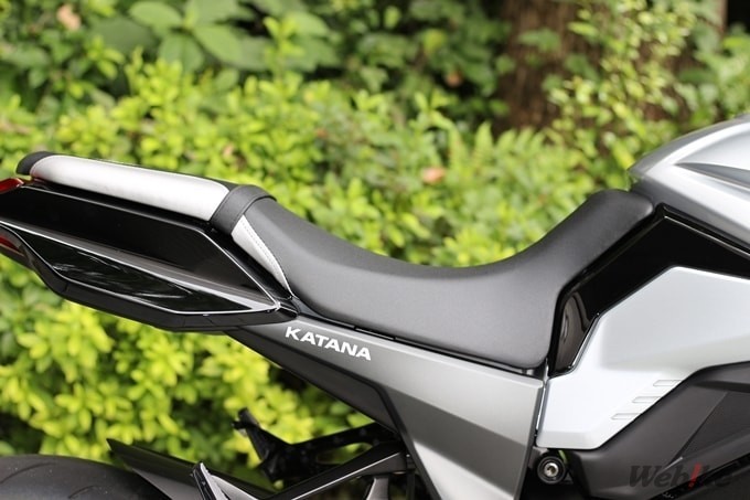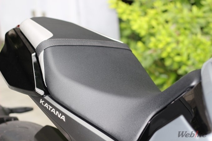 雖然從825mm的數字上來看KATANA的坐墊高度和其他大型摩托車款的平均值差不多,但是因為坐墊有一定寬度,所以雙腳著地性不能算好,連身高173cm的工作人員跨坐上去的後腳跟都會稍微懸空,而如果身高有180cm的話,就能夠穩穩踩在地板上。