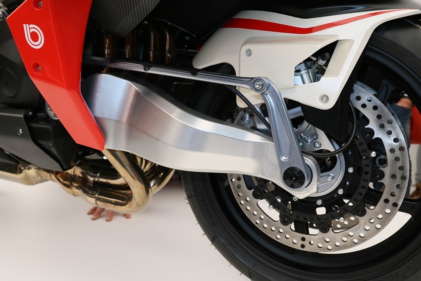 ▲除此之外,這台車還採用了讓TESI成名的「輪轂中心轉向系統(Hub Center Steering)」。這是一種Bimota的獨家結構,以搖臂支撐前輪、中心輪轂則具有轉向功能。