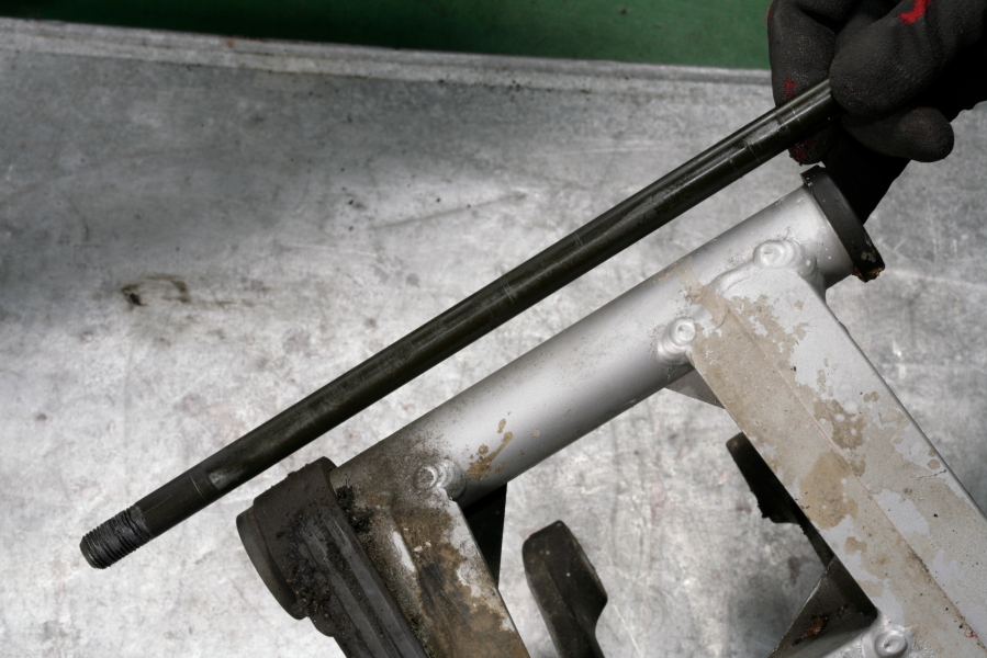 如果在卸下避震器和連桿後卸下擺動臂樞軸,則擺動臂將從框架上脫落。由於沒有任何東西可以支撐車身後部區域,因此對於沒有中駐的摩托車,需要一個穩定的千斤頂來支撐引擎的底部。