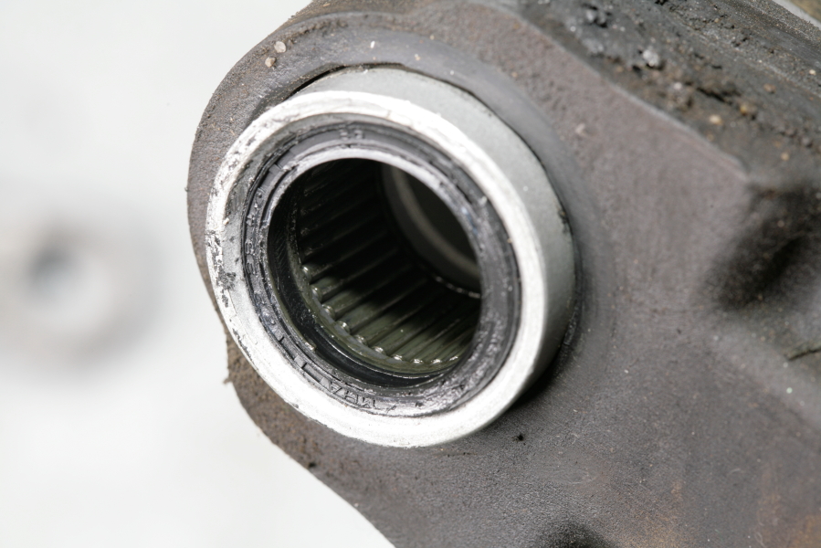 ▲樞軸部分使用滾針軸承,其中排列有許多滾針。在滾針軸承的外部配有雙層防護,中層的是油封及最外層的密封蓋。使用零件清潔劑時噴塗樞軸,先將外層密封蓋取出,噴塗後用牙刷將粘附在滾針多餘油脂擦掉。