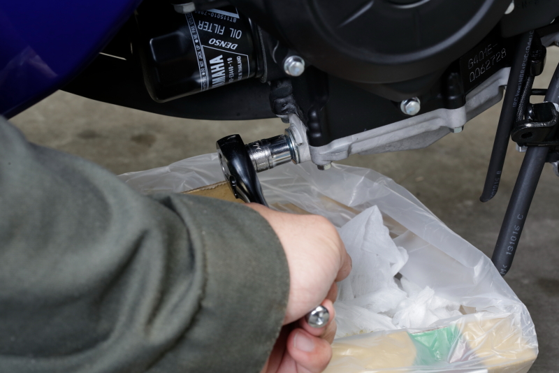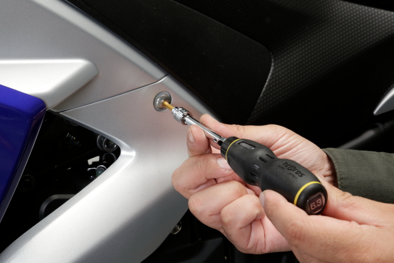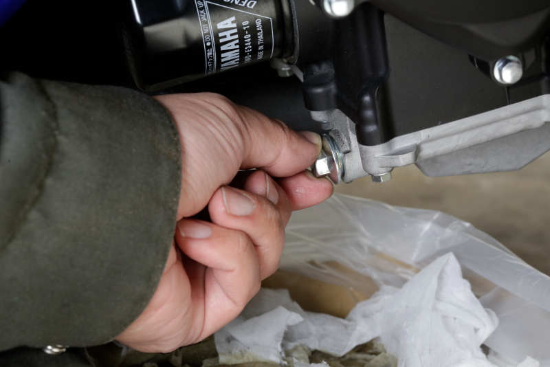 通常YZF-R25的機油螺栓是隱藏在導流罩側蓋內,或者你可以用加長工具,鬆開機油螺栓。但是,如果事先花時間拆下前罩,就可以清楚地看到機油螺栓的位置,便能輕鬆地使用套筒扳手還是棘輪扳手將其拆裝。