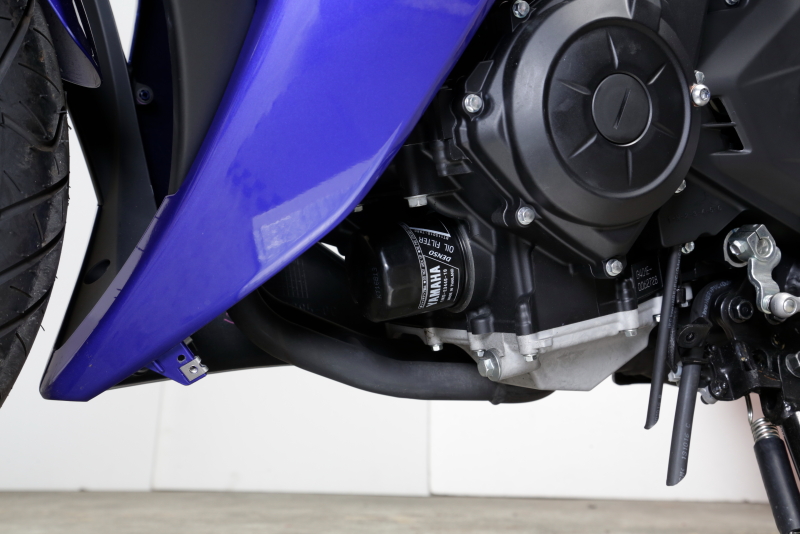▲今天更換機油的車型是YZF-R25,由側罩由藍/銀兩塊組成,讓人看起來很有立體感。安裝引擎前部的銀色部分巧妙地覆蓋排氣管、引擎放油螺栓、機油濾清器等。
