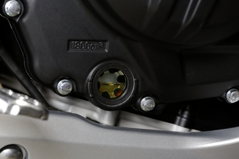 ▲加入約1.6L機油後將車身扶直,透過機油窗檢查引擎內部機油油量。檢查一下,只要在上刻度線和下刻度線之就可以,沒有必要加到上限,接著讓引擎怠速運轉兩三分鐘後再檢查一次,如果機油位低於下限的話,再加入適量機油就可以了。
