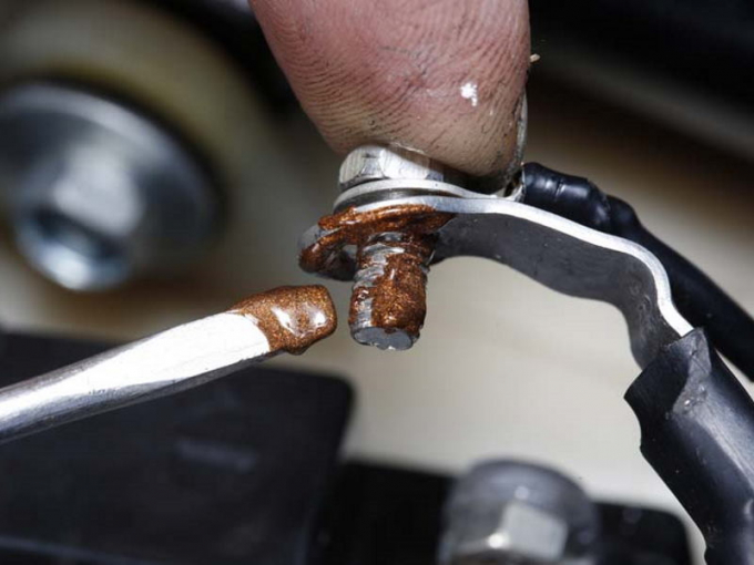 ▲電池端子是最容易發生腐蝕的地方,端子上的螺絲鬆動會降低電流流動,所以螺絲是第一個定期檢查項目 (重新鎖緊),建議在鎖緊螺絲時,在螺紋和端子接觸點上塗抹電流穩定劑,鎖緊後再用抹布擦掉多餘的化學藥劑。