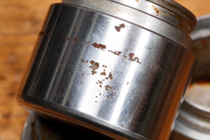 通過使用水壓,那些生銹的卡鉗活塞在壓縮機的空氣作用下不會動彈,很容易就會從卡鉗裏出來。我們在觀察掉出卡鉗的活塞時,發現活塞密封圈接觸部位的頂部和底部有股紅色的銹跡。可能是生銹的地方積了水,銹蝕導致鍍層表面變得粗糙,卡在活塞密封圈上,無法用空氣推開。