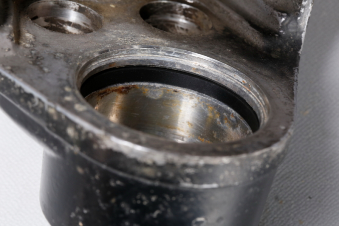 前叉內管的表面處理也是硬鉻,但同樣時間長了就會產生點狀銹蝕。只要前叉油或煞車油附著在鍍層表面並起作用,時間長了卡鉗活塞和內管都不會生銹。但是,當它們處於固定狀態時,含油量會隨著時間的流逝而減少,空氣中的水分很容易到達鋼材表面。