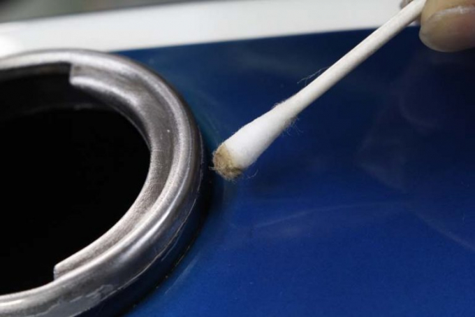逼出汽油後,用棉花棒沾著丙酮 (一種脫脂能力極強的溶劑),將油箱蓋底部縫隙中的去除後,再用抹布擦去丙酮即可。