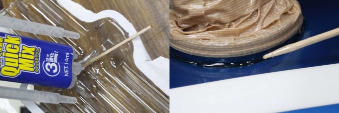 從先前步驟中可以判斷汽油是從油箱蓋底座的裂縫中漏出,而環氧樹酯就是修復這類裂縫的最佳解決方案,這次使用的是兩種液體同時從注射器中推出,兩種液體會在此過程中進行混合,但是由於滲漏點很小,因此很容易會浪費掉,我認為使用流動性高的產品是比較好的選擇 (一般是A、B兩種液體分開,使用者可以需求擠出適量液體進行混和)。