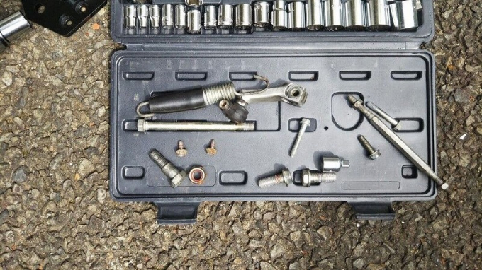 我必須拆掉排氣管才能把螺絲取出來,雖然有點麻煩,但是排氣管移開後才有足夠的間隙拆下螺絲,至於排氣管,只需要卸下一些螺絲即可。