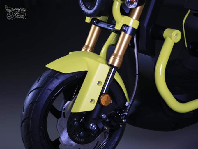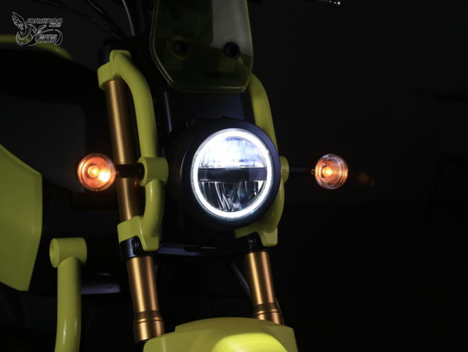 大燈方面採用投射式 LED 圓燈,方向燈採用傳統燈泡形式,三角台方面採用與檔車相似的上下雙三角台設計,單就造型來說猛一看竟有種看到 MSX 的感覺,而從整體設計上來看,開發時應是採取玩樂取向的設計基調。