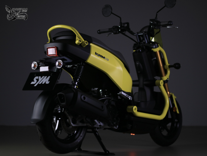 車尾一覽,整體設計風格較為方正,類似保險桿的設計從車身中段一路延伸到龍骨上,導入了 SYM 自豪的三零科技,零後仰懸吊系統、零噪音零污染怠速熄火系統及零延遲啟動系統等。