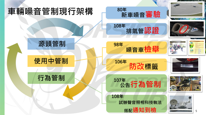 目前我國的噪音管制分成三個方向,一是從源頭管理,例如新車噪音審驗或是改裝排氣系統的認證,二是針對使用中車輛管理,例如噪音車輛檢舉或是以貼紙來降低人民改裝排氣系統的意願,第三則是行為管制,聲音照相科技執法就是行為管制的範疇,旨在透過科學儀器將違規事實量化,並用以舉證及裁罰。