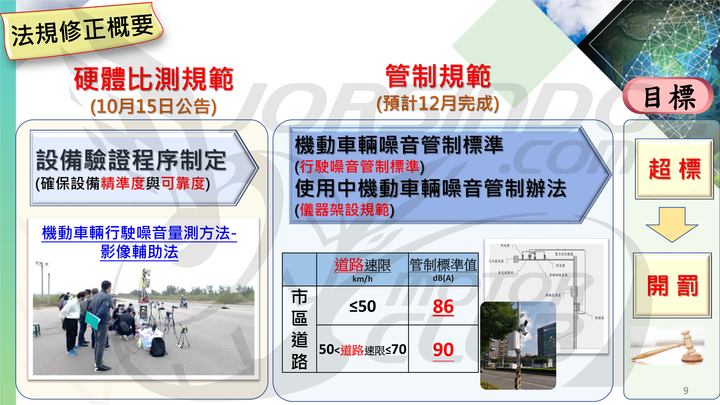 硬體的比較測試規範已經在十月中旬上路,而後續的管制與裁罰規範也預計將在 12 月完成,明年 1 月 1 號整套系統就會正式上線,並陸續在各縣市申請的區域安裝,而目前訂定的標準是以「道路速限」對應指定的「管制標準值」,例如限速 50km/h 或以下的路段,裝設噪音科技執法系統的時候就會以行進間測得的噪音值 86 dB(A) 為裁罰標準,此噪音標準來自 2500 筆新車型行進間噪音審驗數據。