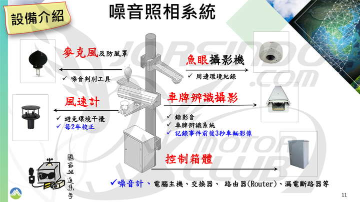整套噪音科技執法系統會包含麥克風一組、風速計一組、攝影鏡頭一組、環景攝影機一組、主機本體一台。