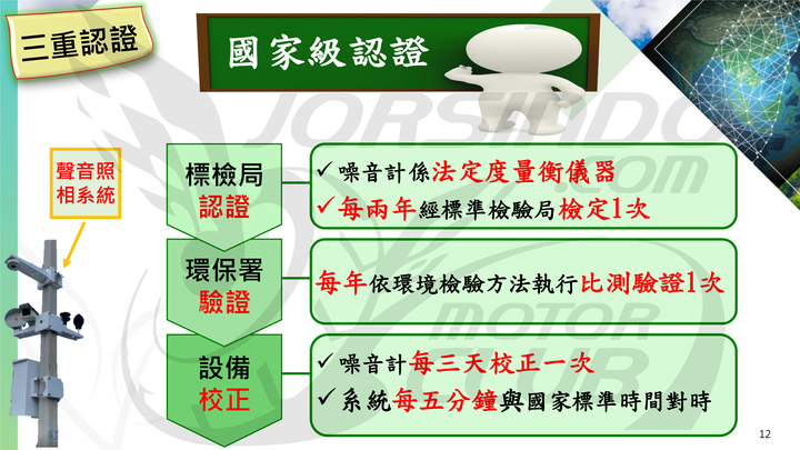 有了區間測速科技執法的前車之鑑,環保局在設備檢證上可說是下足功夫,並以三重認證來消弭大眾對於執法器材的準度疑慮,首先是標檢局的部分,噪音計每兩年需送標檢局檢定一次,整套系統每年都需透過比測驗證來保證其精度,各別設備部分,風速計每兩年需要校正一次,噪音計每三天需要校正一次,而系統本身每五分鐘會自動正時一次,以確保其公正性。