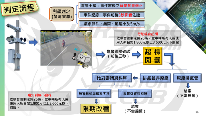 噪音科技執法裁罰有三個條件:案件成立背景音量未超過規定值、案件成立當下無雨、案件成立當下風速小於 5m/sec,而在噪音計偵測到超標噪音後,系統會記錄下偵測到超標噪音的時間點,並將該時間點前後三秒的影像擷取下來用以佐證,一旦超標便會以人力檢驗違規事實,如果成立便會以噪音管制法 26 條開罰,可處新台幣 1,800 元到 3,600 元以下罰鍰,如果比對雲端資料庫後發現影像中的車輛排氣系統非屬原廠則會責令驗車。