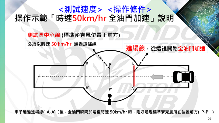 當車輛進入 A-A’ 的進場線後就要開始全油門加速直到通過 B-B’ 線,車輛通過測試區中心線的 P-P’ 線時須達到時速 50km/h,而系統會採計車輛通過 P-P’ 線時的噪音值。