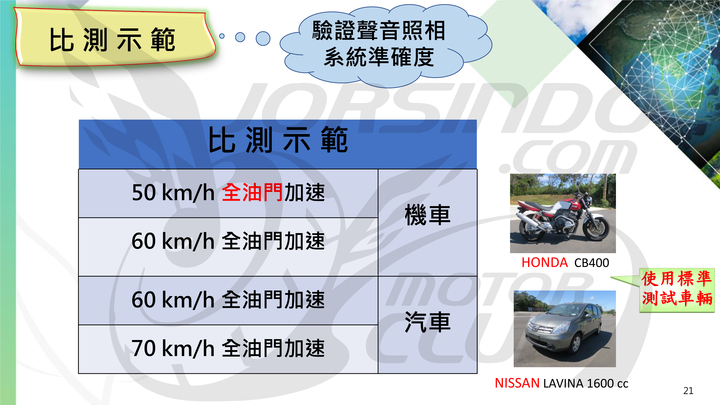 比測示範部分,汽車、機車分別採取兩種測試,機車需進行 50km/h、60km/h 的全油門加速測試,汽車需進行 60km/h、70km/h 的全油門加速測試。