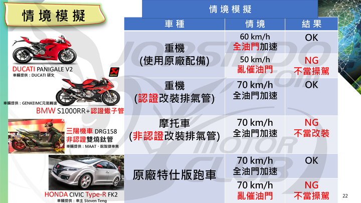 而為了讓現場媒體可以理解所謂「抓吵不抓改」,駕駛行為才是噪音問題主要來源的核心概念,現場以五種不同的車輛與排氣系統組合來做示範,下圖為模擬情境以及預設的測試結果。