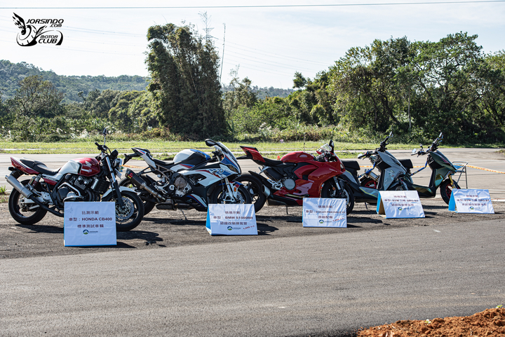本日用來實測的車輛,分別比測示範用的原廠 CB400,情境示範用的原廠 S1000RR 搭配認證改裝管、原廠 PANIGALE V2、DRG 搭配認證改裝管、DRG 搭配非認證改裝管。