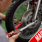 在這裏,我把T型扳手的手柄放在鏈條和齒盤之間,讓摩托車自己稍微往後咬,轉胎的時候不要太用力,因為過緊會損壞鏈條和傳動軸,如果是只有側駐的運動車款,那麼用上鉗子來增加張力也是很有幫助的。