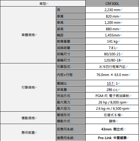 配備方面更搭載後輪可關閉ABS、滑動離合器與檔位顯示等高階二輪科技,同時,286cc的排氣量更符合台灣大型重型機車路權,車主將在與CRF300L 或CRF300 RALLY體驗冒險旅途的樂趣中,兼顧通勤便利的需求,拓展更多未知道路的可能。