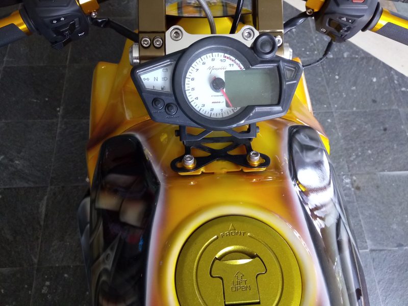 除了油箱是取自CBR150R以外,其他包括鋼管車架及前懸吊系統等,皆為手工設計、製造的客製化零組件。而為了增加亮點,整輛車都按照大黃蜂的角色採用黃金色烤漆。