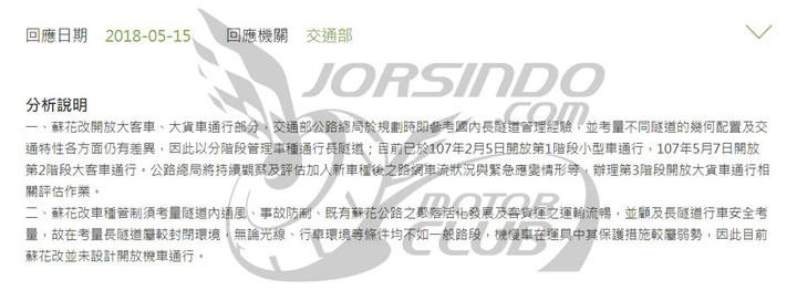有賴於民間團體與車友們的到處奔走與支持,在公共政策網路參與平台上也曾提案過開放蘇花改多車種通行,而不是獨厚小客車。由於達到聯署標準,公路總局也很盡責的回覆了。不過收到的答覆竟然是「以考量長隧道屬較封閉環境,無論光線、行車環境等條件均不如一般路段,機慢車在運具中其保護措施較屬弱勢,因此目前蘇花改並未設計開放機車通行。」這種理由。