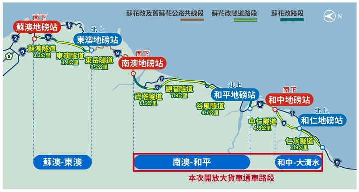 根據公路總局於 1 月 11 日的公告文令,蘇花改公路南澳段至大清水段將於 1 月 19 日上午 9 點開放大貨車行駛,目前規劃車種為 12.2 公尺以下大貨車,加上原本開放的蘇澳到東澳段後,代表大貨車已能全線通行。12.2 公尺以上以及載運危險物品之車輛並不在此範圍內,仍然須行駛台 9 丁。
