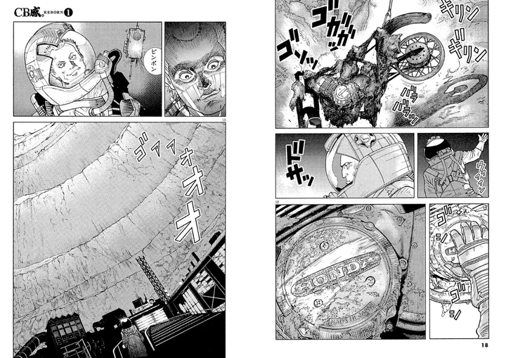 書名有點怪,中譯為 CB 快感,但還有英文書名叫 CB Reborn ,這比較好懂啦!因為內容有復活 CB 750Four 的情節。這部同樣是東本昌平畫的,不過是科幻故事。內容講述在 20xx 年的未來,科技已經發展到像鋼彈那樣有宇宙殖民地的時代,但在這架空世界裡騎摩托車是不合法的….(作者是先知?)。但當然啦,主角一夥人就是愛躲起來在廢棄道路偷偷飆車 (有點像 AKIRA的橋段)。或是默默地藉由在廢棄處理場工作之便、挖掘摩托車的零件、暗地裡組車等等。故事非常有趣!最後隨著劇情發展也十分有趣、這邊就不暴雷了。