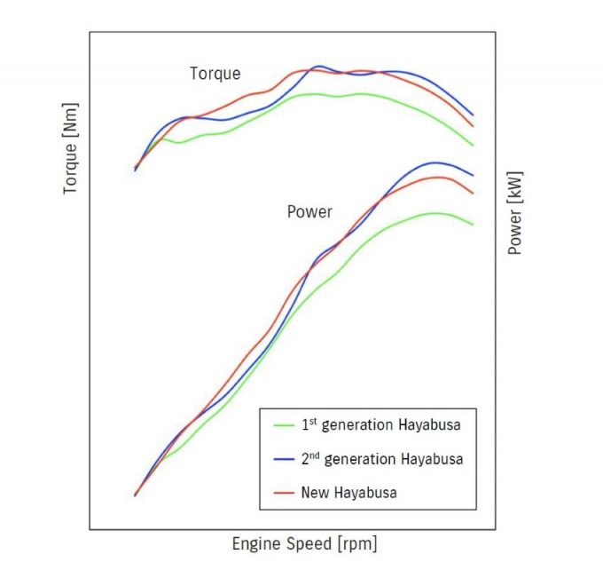 引擎的最大馬力少了7ps變成190ps(日規因為測量方法不同,所以馬力少9ps只剩188ps),所以扭力曲線圖畫出來的結果完全超過了第一代Hayabusa。