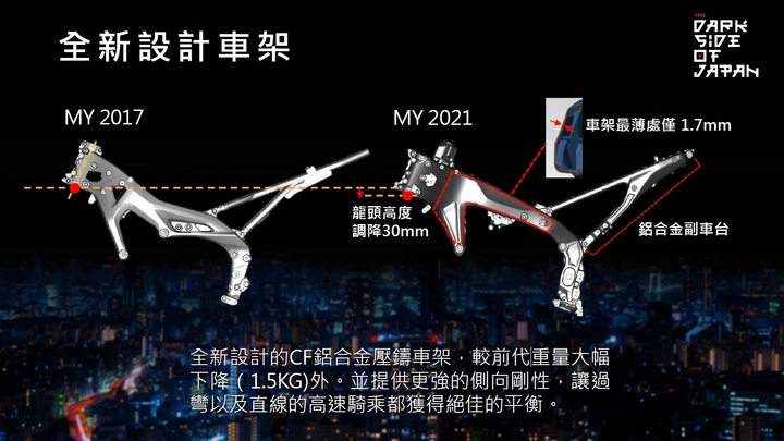 新車架設計降低了龍頭高度 30mm、並且大幅減輕重量 1.5kg。
