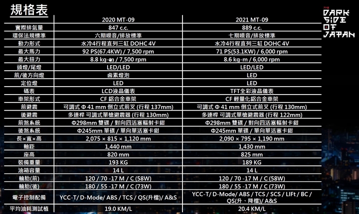 但畢竟一切的源頭都是為了對應國內環保法規而不得不的方式。不過雖然數據如此,2021 MT-09 的暴力加速仍相當迷人,雖然 MT-07 的帳面馬力更大,但兩車迸發的加速感是完全不能比擬的,MT-09 實在是野太多了。