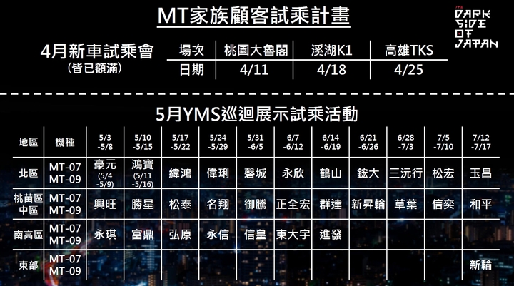 必須要先跟各位網友說抱歉啦!北、中、南在賽車場舉辦新車試乘活動皆已額滿!因此如果對 MT-07、MT-09 有興趣、想試乘的網友,從 5 月初起到 6 月中為止,台灣山葉還安排了 YMS 巡迴展示與試乘,詳情請見下表。