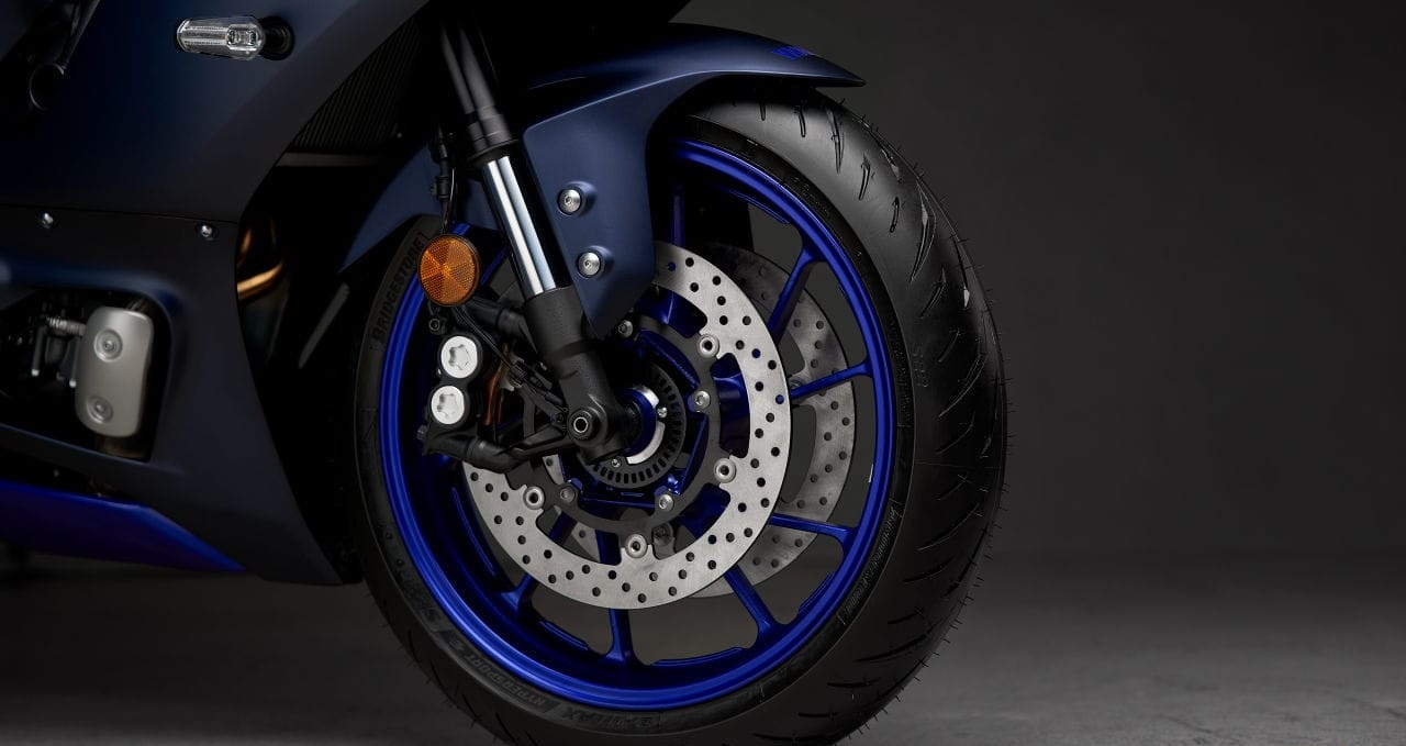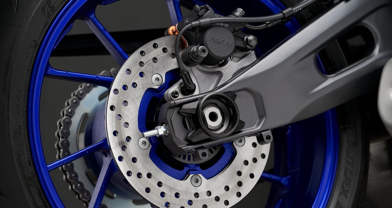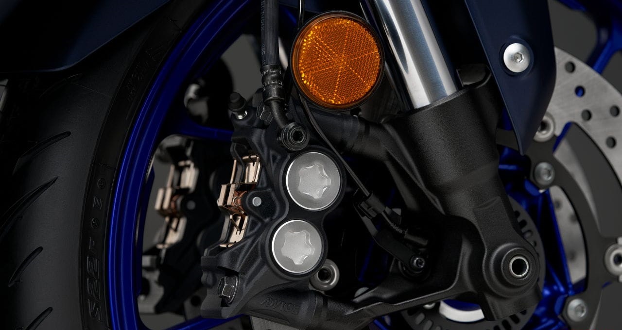 煞車系統部分,前輪採用直徑298mm雙浮動碟盤搭配YAMAHA自家御用、俗稱”雙子星”的輻射對四卡鉗與直推總泵的組合,確保高制動力及可控性,十幅造型的輪框則是由鋁合金製成。