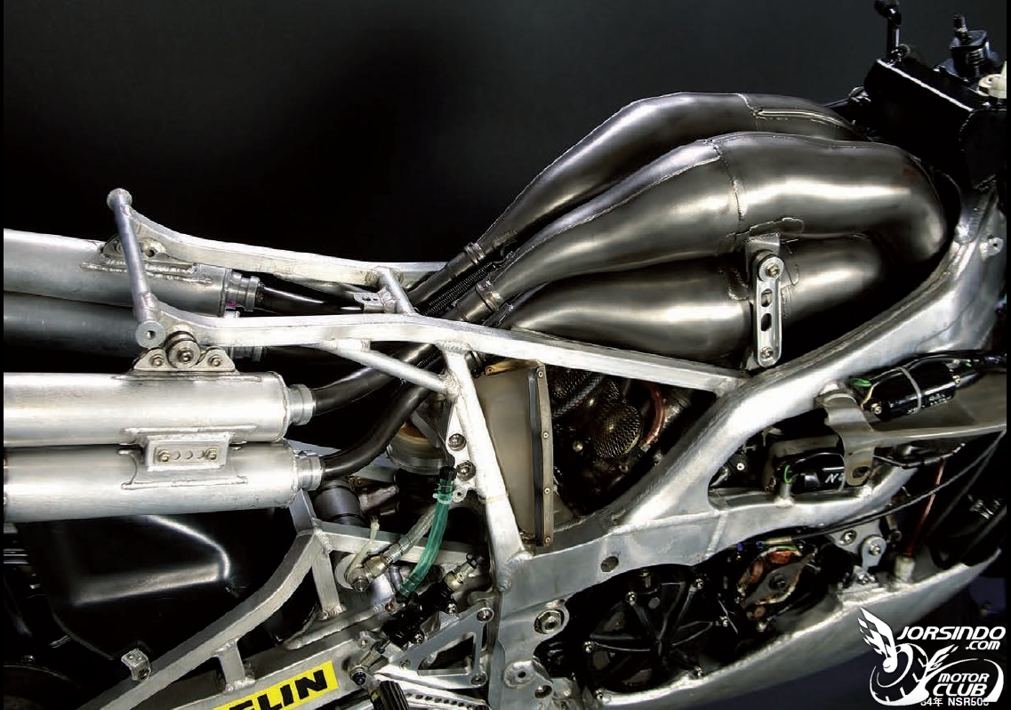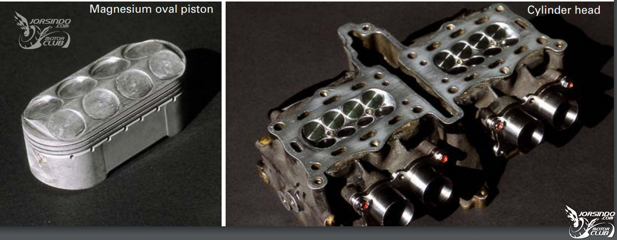 開發階段,HONDA 工程師認為推出 32 汽門 V8 引擎應該能與對手的二行程賽車抗衡。但由於當時 WGP 規定引擎不得超過四汽缸,因此 HONDA 以 V8 引擎的結構為概念,再將每兩個汽缸結合再一起,這不就是 V4 了嗎?以這樣的理念開發出了全新的 WGP 賽車 NR500!搭載前所未見的橢圓形活塞設計、雙連桿、8 汽門的特別引擎。