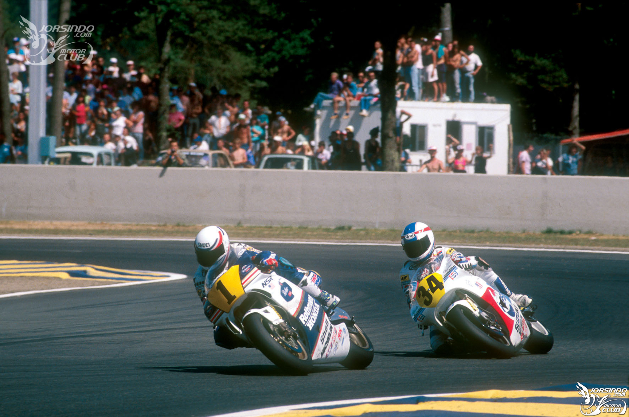 1989 年剛轉隊至 HONDA 的 Eddie Lawson 與 SUZUKI Kevin Schwantz 近身纏鬥。