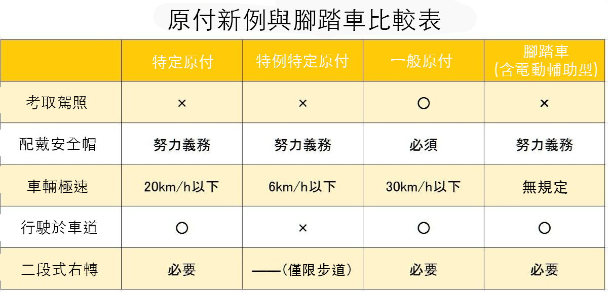 現行的原付級距,往後預定改成「一般原付」。電動滑板車等特定原付車款,由於極速在10km/h左右,因此無需考取駕照及配戴安全帽。※本表為筆者以警察廳資料為基礎製作