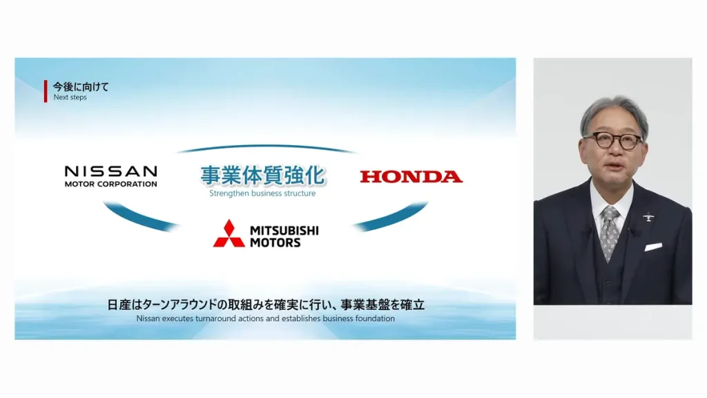 「面對汽車行業日益嚴峻的環境變化,我們認為,透過融合HONDA與NISSAN多年積累的知識、人才及技術等經營資源,創造移動性載具的全新價值至關重要。雖然目前僅處於探討階段,尚未決定業務整合該如何進行,但我們希望透過這兩家各具特色的企業能產生化學反應,成為唯一無二的『創造移動性載具新價值的領導企業』。我們將以2025年1月底為目標,探討經營整合的可能性。」