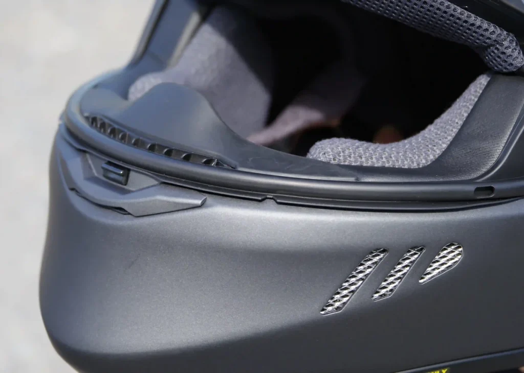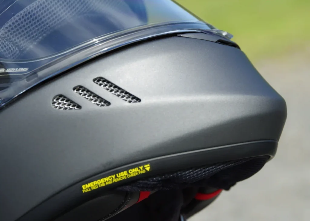或許因額頭上方的進氣孔尺寸較小,低速時感受不太到通風效果,但超過60 km/h之後,悶熱感明顯改善。最令人驚豔的是標誌性三道開口槽的實際功效,不僅口部,連臉頰部周圍的熱氣都能有效排出,感到舒適。相比頂部通風孔在低速時即可感受其散熱效果。