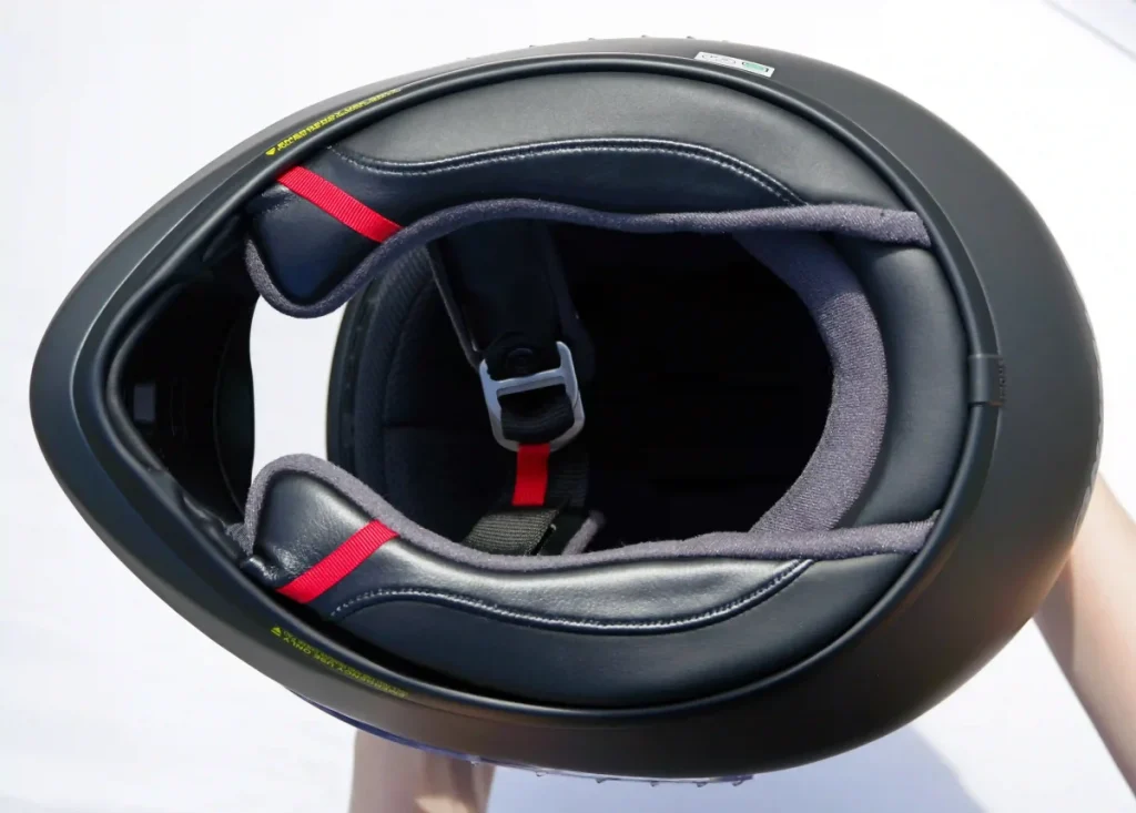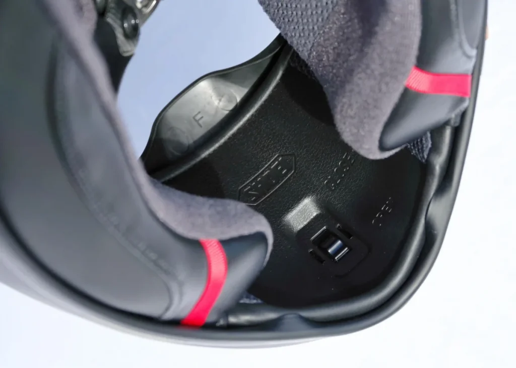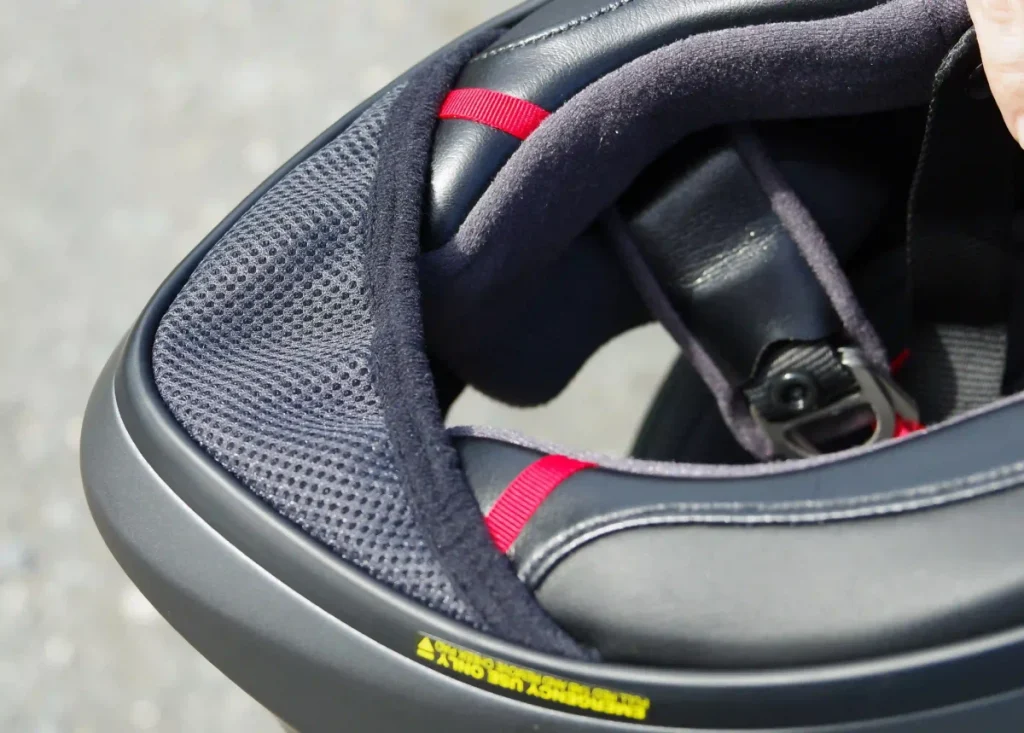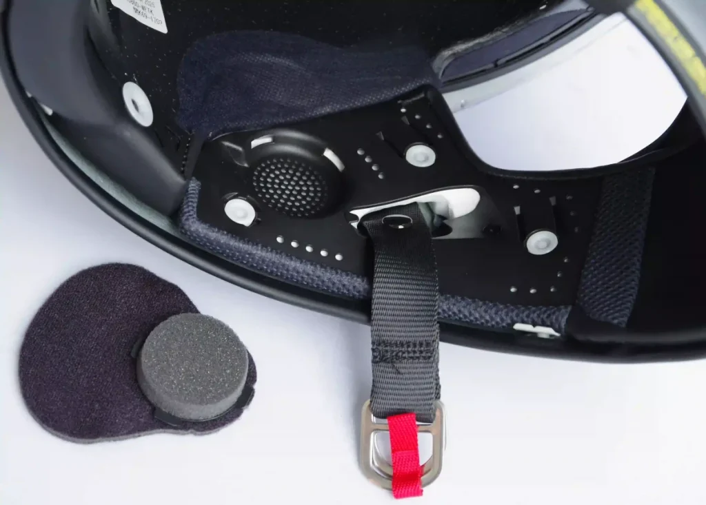 面頰墊(Cheek Pad)採用全新設計,底部增厚能柔軟地貼合頸部。與皮膚接觸的部分採用柔軟的絨布,並配備面頰墊緊急快拆系統。頤帶(Chin Strap)採用D型扣環式固定。