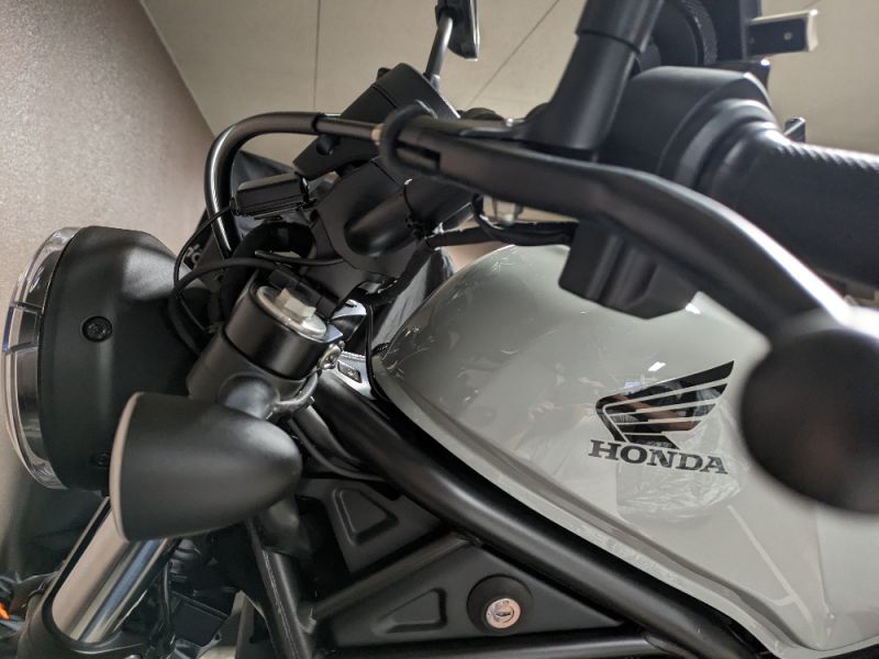 「因為 Rebel 250 (Rebel 500) 用的 MotoRoad 8 吋 Robot 把手缺貨,所以我買了這款,自己加工鑽孔裝上去了。光是決定鑽孔的位置就花了我不少工夫。」