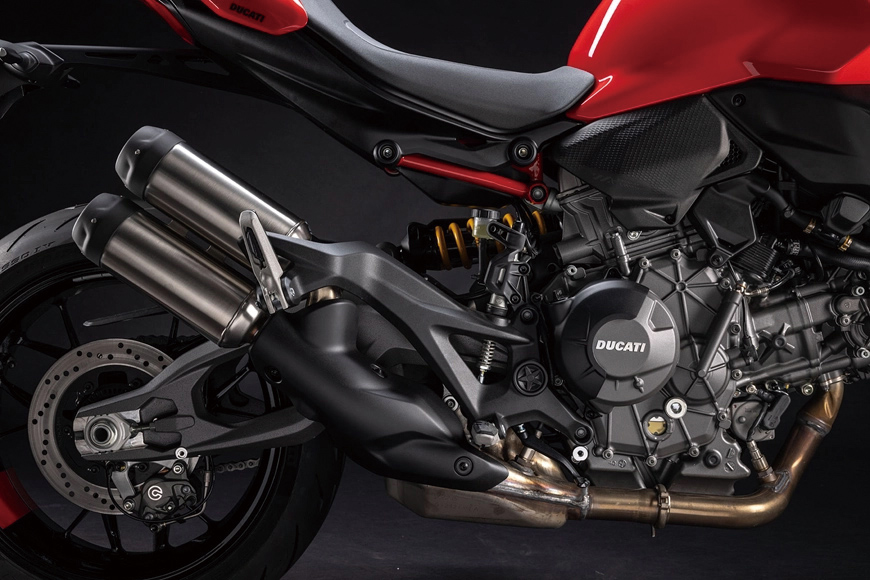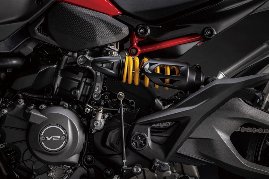 與以前一樣,新車將採用雙側搖臂,但現在更加突出,採用了一種空心設計,顯然受到了Panigale V4超級跑車的啟發。車身前後均採用Showa彈簧懸掛。前懸掛為不可調整的43mm套筒式彈簧,後懸掛為預載可調的單筒避震器。標準座椅高為815mm,但可透過更換座椅和降低套件將座高降低至775mm。