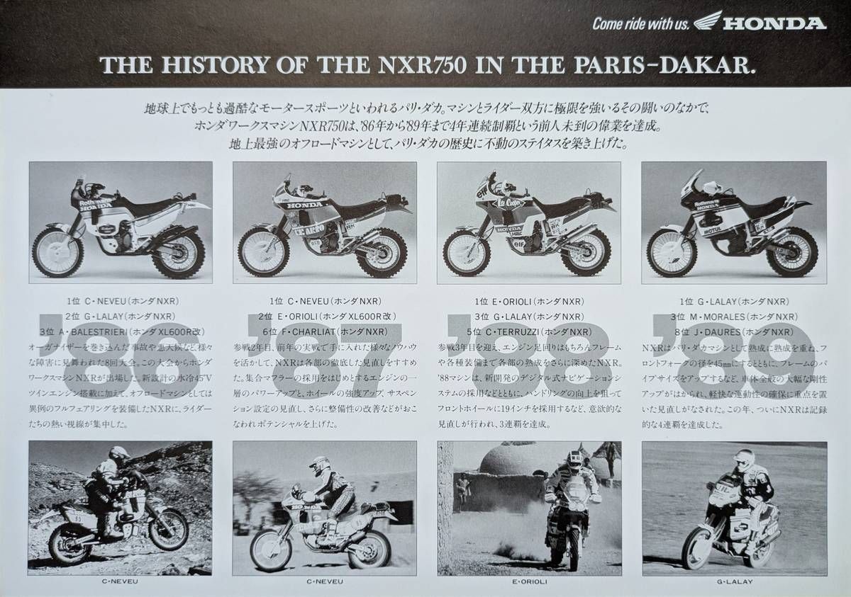 1989 年的巴黎-達卡,Gilles Lalay 選手駕駛 NXR750 奪冠,寫下了四連霸紀錄,完美證明了該車系的可靠性與耐久度。此外,在以市販車為基礎的「馬拉松組」(Marathon Class)中,Africa Twin 的使用者也於 89 年與 90 年相繼奪冠,展現出強大的潛力。