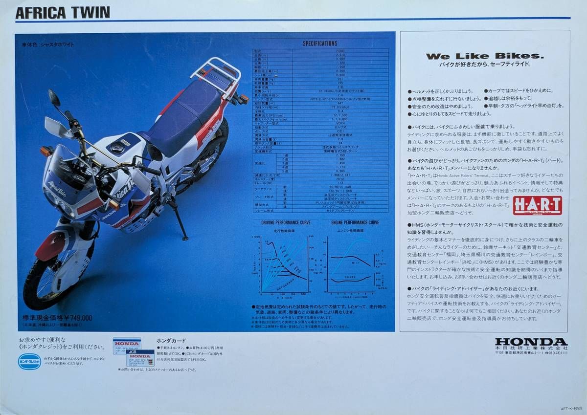 1988 年 5 月,融合了 NXR750 贏得巴黎-達卡三連霸技術結晶的冒險運動車款 —— Africa Twin 非洲雙正式上市。當時在日本境內僅限量販售 500 台。
