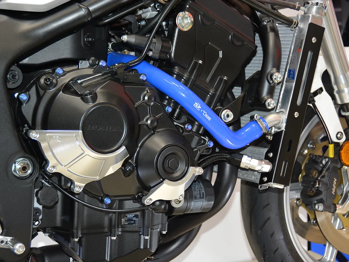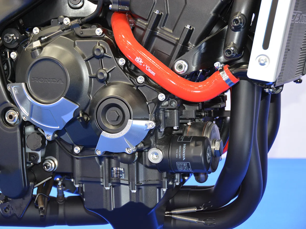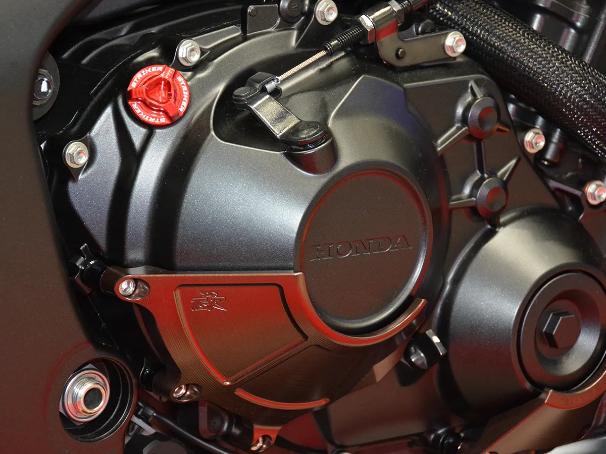 - 引擎右側換上紅色 TSR × DEGREE 水管,離合器蓋亦加裝防護殼。