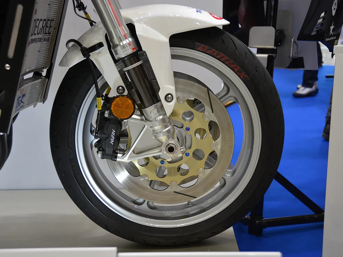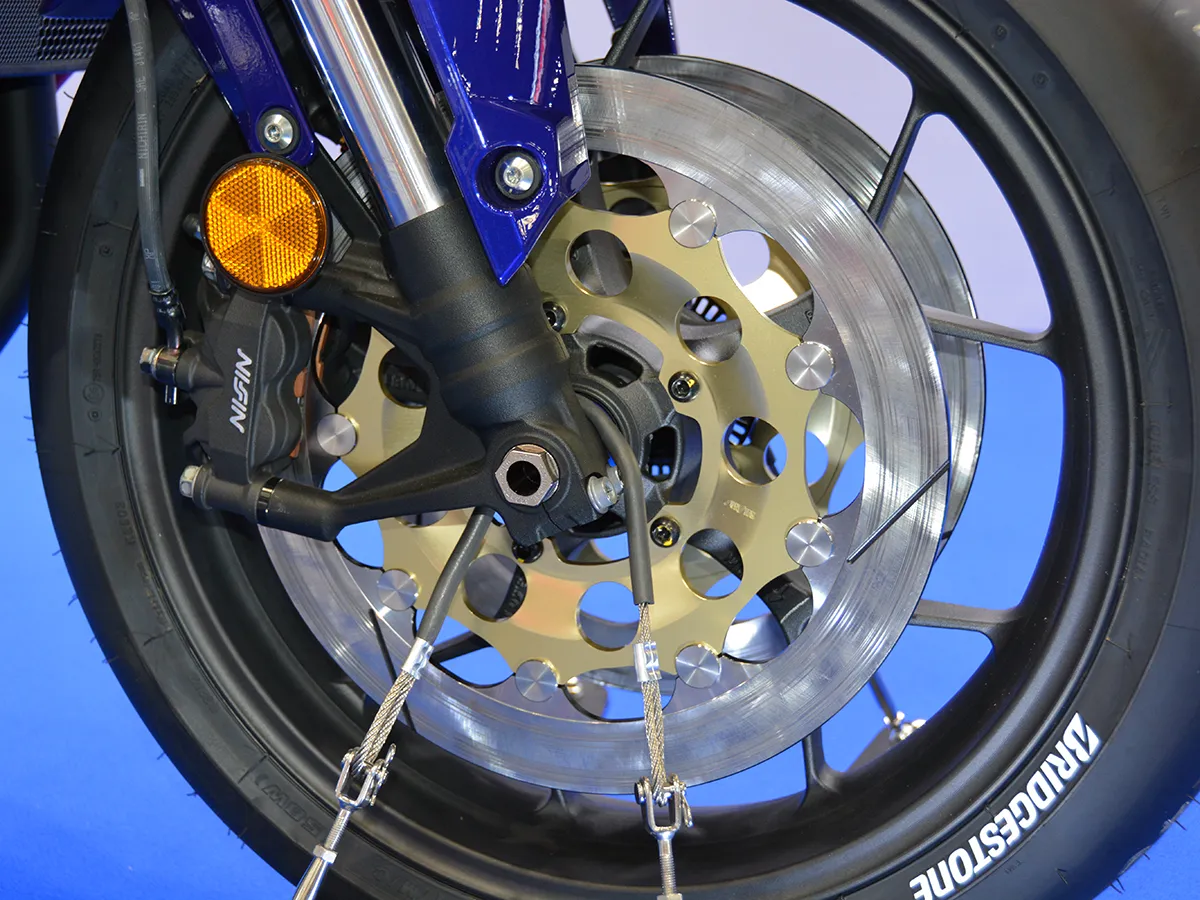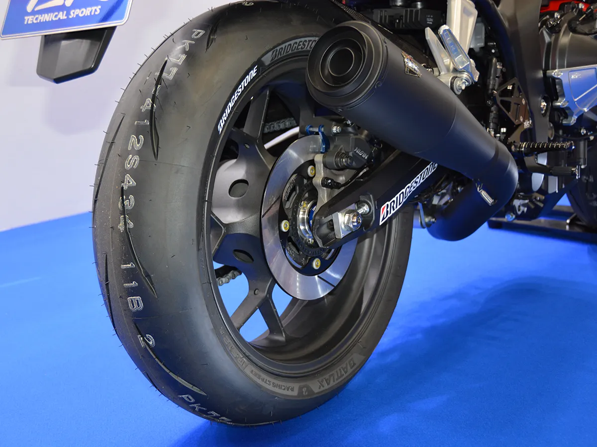 - 後輪同樣配備開槽式碟盤,輪胎選用 Bridgestone Battlax RS12。