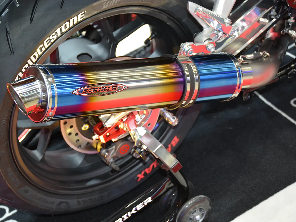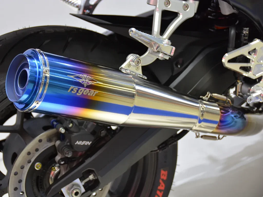 裝配具備賽車燒色的「Drag Blue」鈦合金全段排氣管(UP-TYPE)。Wyvern Megaphone Titanium Full Exhaust Single UP Type