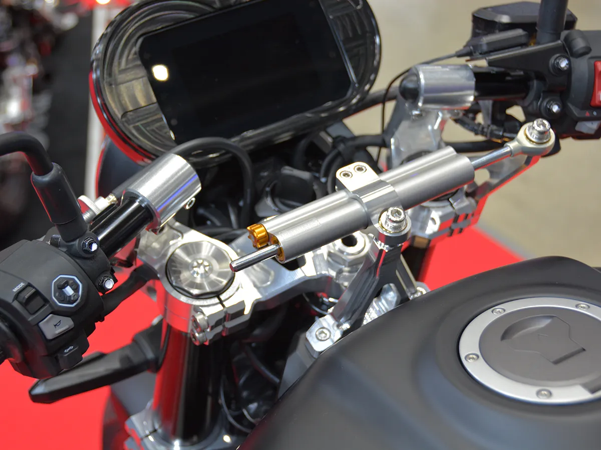 精密配置: 裝配橫置式防甩頭(轉向穩定器)、乾式碳纖維煞車護弓及極輕量的鍛造鎂合金輪框,展現濃厚的賽道技術。