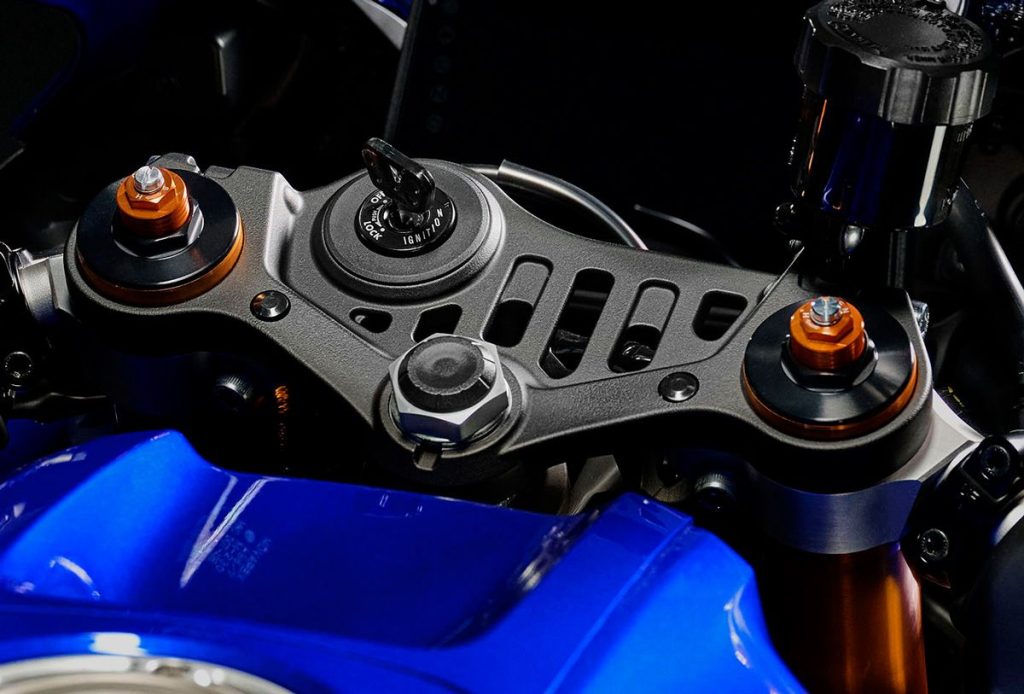 41mm 倒立式前叉維持全可調設計,但透過鋁合金化活塞桿與彈簧線徑修改,成功輕量化 350g。搭配軸距處的設計調整,優化剛性並提升直線穩定性。三角台也採新設計,上三角台改為兼顧剛性與輕量化的鏤空款式。
